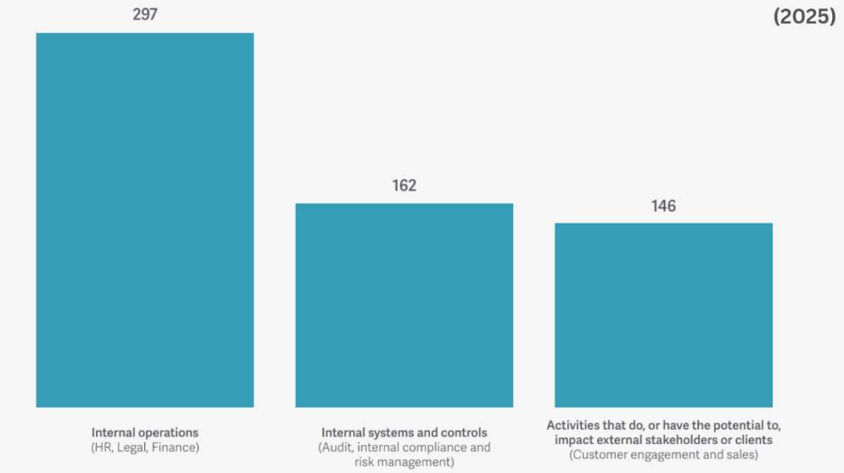 The survey results also underscore a cautious and controlled approach to deployment. Many firms continue to prioritise their use of AI on internal functions and processes, rather than external or customer-facing applications. This caution is reflected in the divergence of AI applications in use, as well as the need to build experience and develop appropriate governance frameworks.